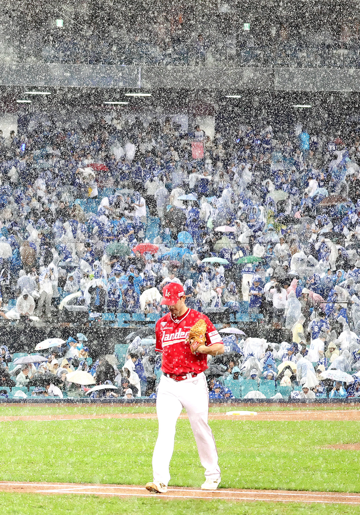 해피엔딩이 되지 못했다. 그를 웃게 했던 비가 이번에는 그의 어깨를 다소 무겁게 짓눌렀다. 1회말 시작과 함께 갑작스런 폭우가 쏟아지면서 경기가 37분이나 중단됐다. 우천 속 쌀쌀해진 날씨 속에서 어깨가 식으면 안되는 어려운 미션이 주어졌다.