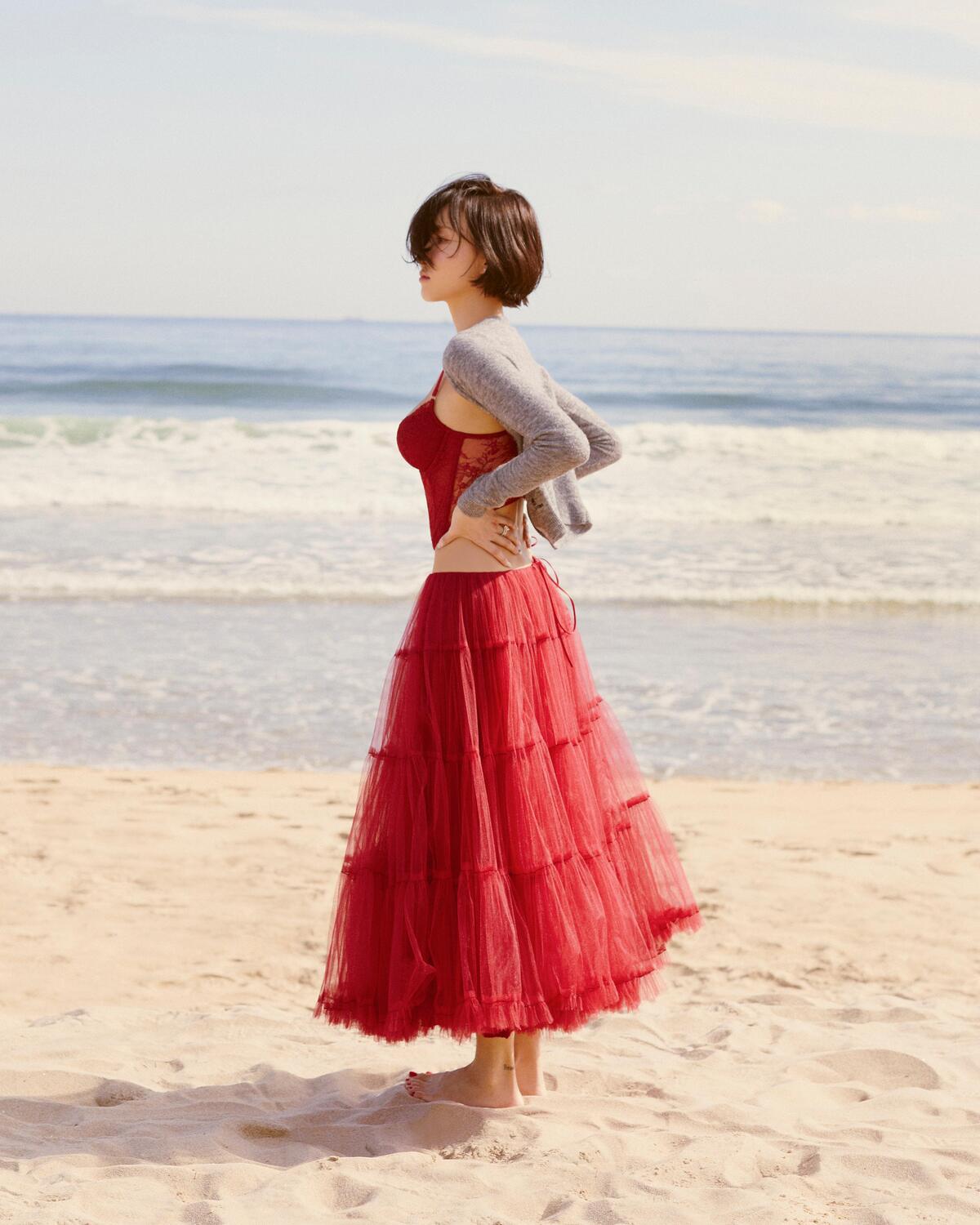 공개된 이미지 속 단발로 변신한 화사는 탁 트인 바다를 배경으로 붉은 투피스 스타일링을 선보이며 우아한 자태를 자랑했다. 또한 곡명 ‘Good Goodbye’ 자수가 새겨진 베일을 쓴 채 깊은 눈빛으로 정면을 응시, 몽환적인 무드까지 자아내고 있다.