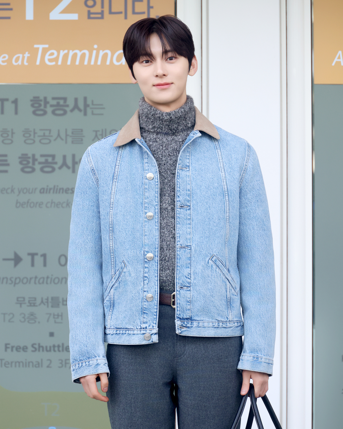 이날 훈훈함 가득한 비주얼로 공항에 등장한 황민현은 스웨이드 카라가 포인트인 연청 데님 재킷에 그레이 컬러의 알파카 울 터틀넥 스웨터를 착용해 부드러운 분위기를 더했으며, 릴랙스드 핏의 울 팬츠로 트렌디하면서도 자연스러운 실루엣을 완성했다.
